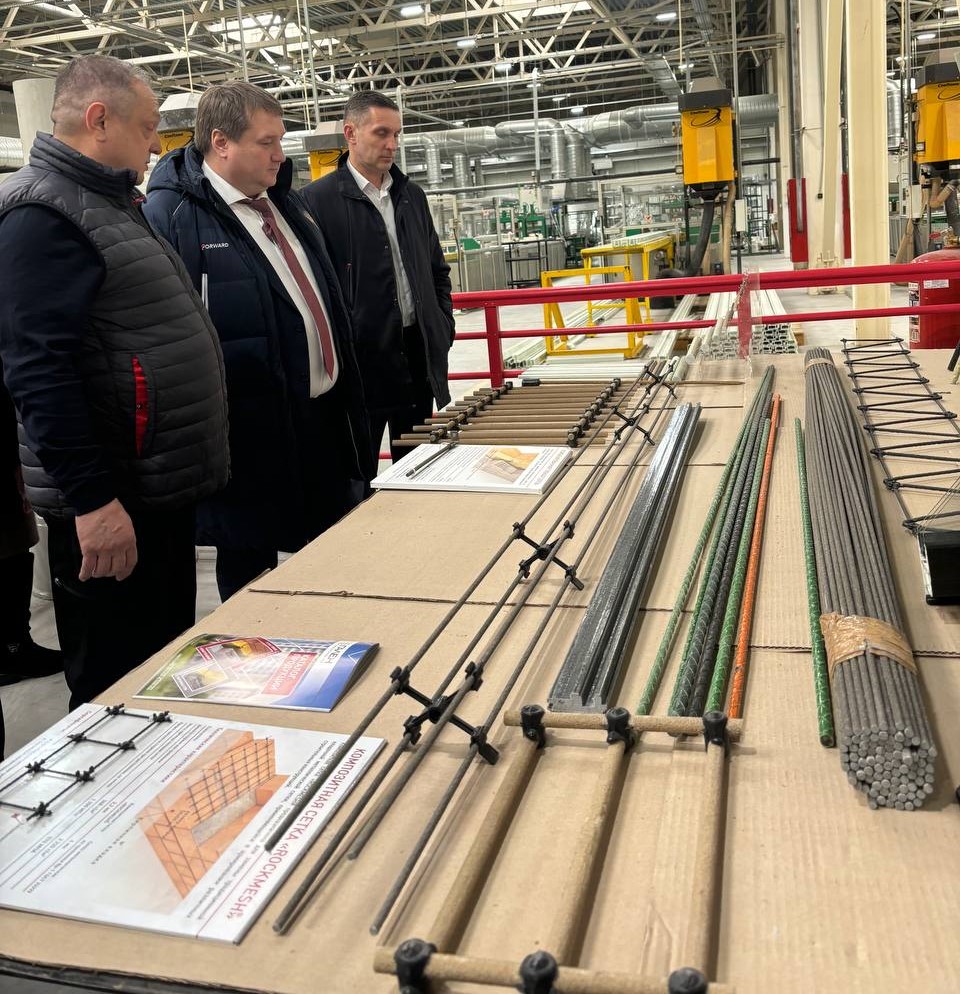 Исполнительный директор предприятия Валентин Андреев подробно рассказал о процессах производства продукции, используемом сырье и оборудовании. На площади индустриального парка компания занимается изготовлением композитной арматуры, оконного профиля и оконных конструкций из него, гибких связей и опор освящения.
