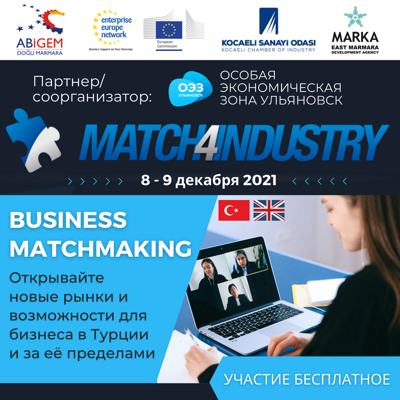 8 и 9 декабря 2021 г. пройдет онлайн-мероприятие Match4Industry, целью которого является установление новых деловых контактов и кооперация с европейскими компаниями, в том числе предприятиями турецкой провинции Коджаэли.