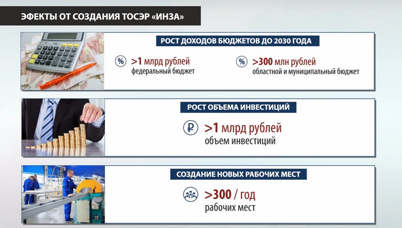 Механизм особой территории позволит существенным образом повысить привлекательность моногорода для ведения бизнеса, обеспечить местное население рабочими местами на долгосрочный период. С улучшением инвестиционного климата в моногороде Инзе ожидается создание новых производств и дополнительных производственных цепочек.
