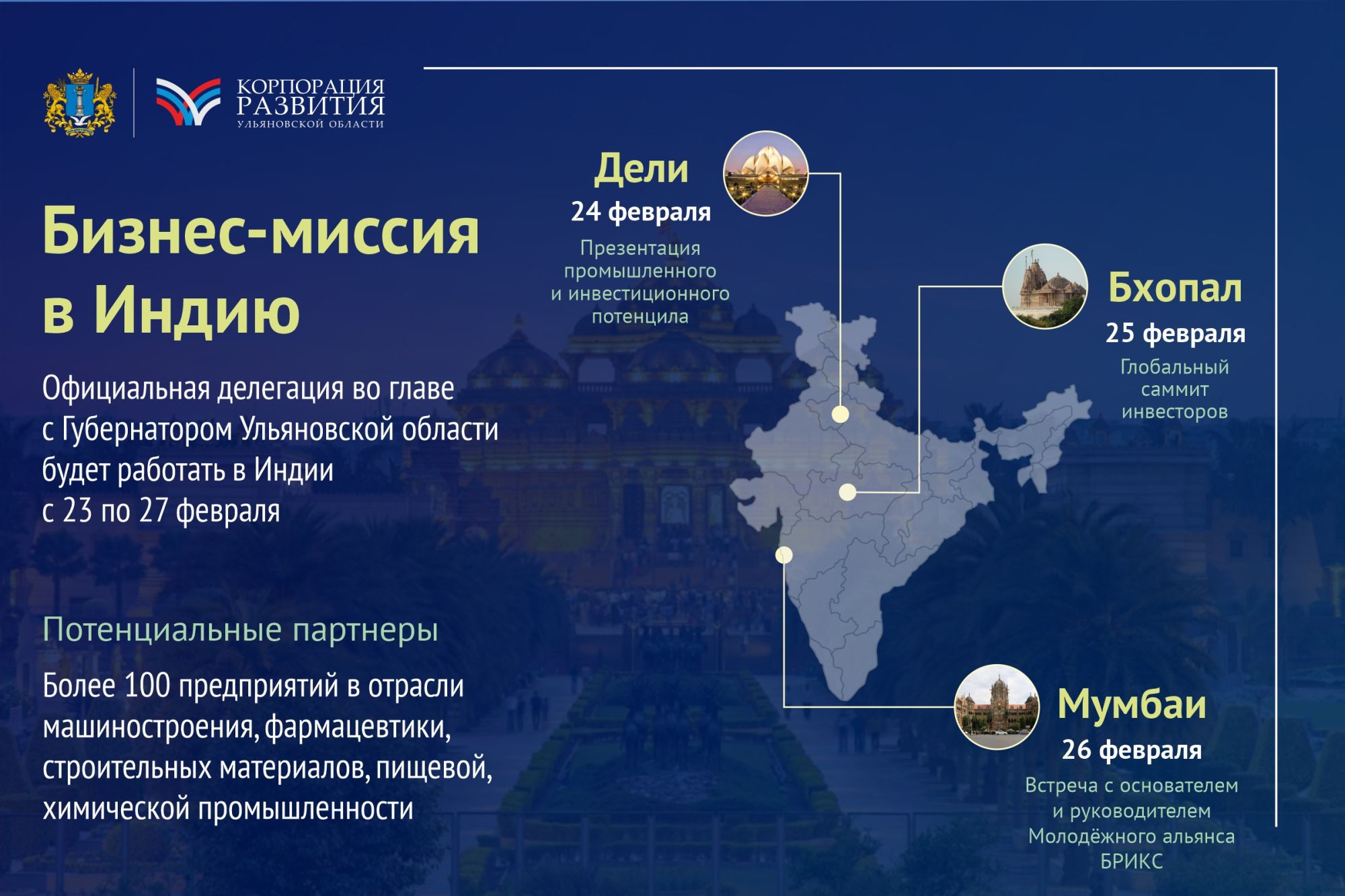 Помимо деловых переговоров, программа визита включает участие в тематических мероприятиях. В период с 24 по 25 февраля в городе Бхопал, штат Мадхья-Прадеш, состоится Глобальный Саммит Инвесторов. Организатором Саммита выступает Правительство штата Мадхья-Прадеш, мероприятие проводится при поддержке Конфедерации индийской промышленности, крупнейшего объединения бизнеса Индии. Это позволит оценить потенциал индийского рынка и определить наиболее перспективные направления для развития торгово-экономических связей между Ульяновской областью и Индией. Результаты миссии станут важным шагом в укреплении двустороннего сотрудничества.